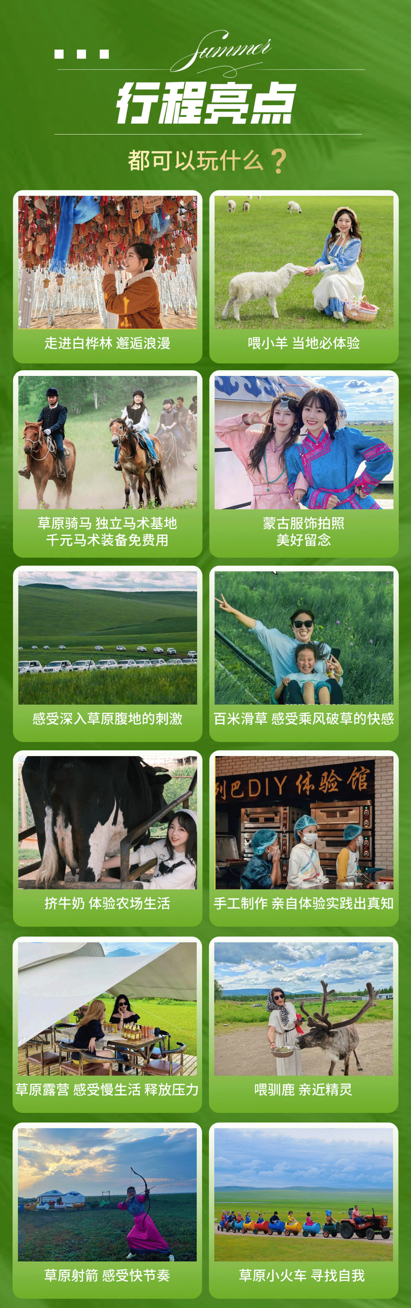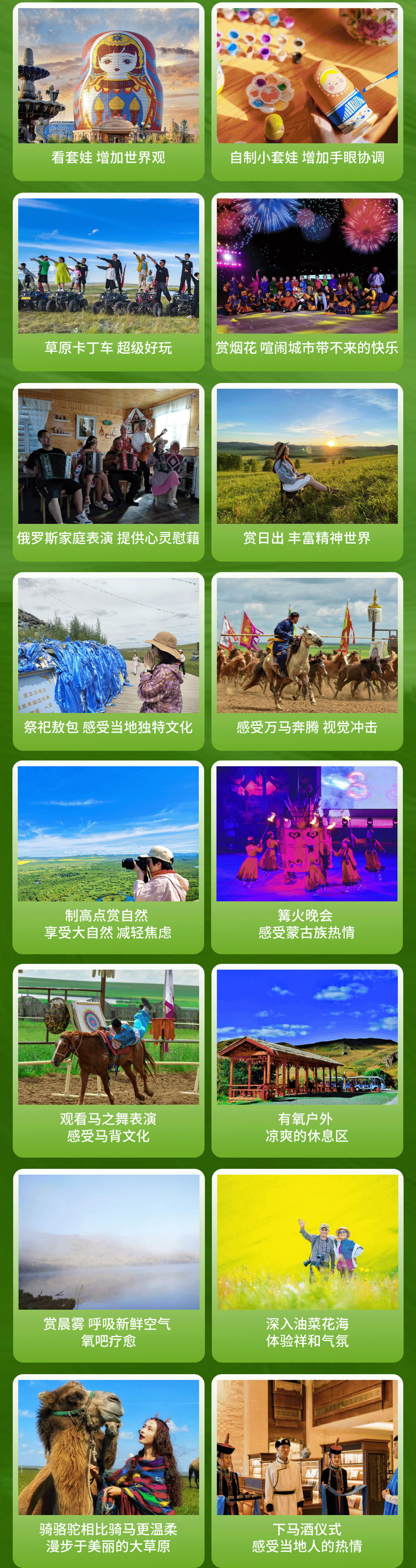 7.贈(zèng)送娛樂(lè)項(xiàng)目:穿蒙古服飾拍照、擠牛奶、喂小羊、草原托馬斯、品嘗蒙古小吃、祭祀敖包、蒙古小課堂、蒙古燒燙氈畫(huà)、網(wǎng)紅天梯打卡、篝火晚會(huì)、民族樂(lè)器展示、夜游滿(mǎn)洲里、旅行社責(zé)任險(xiǎn)、人身意外險(xiǎn)
