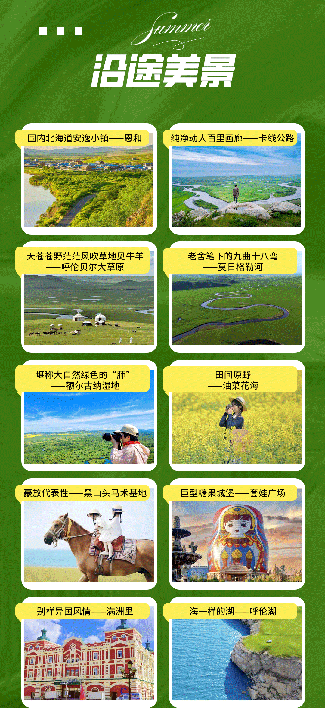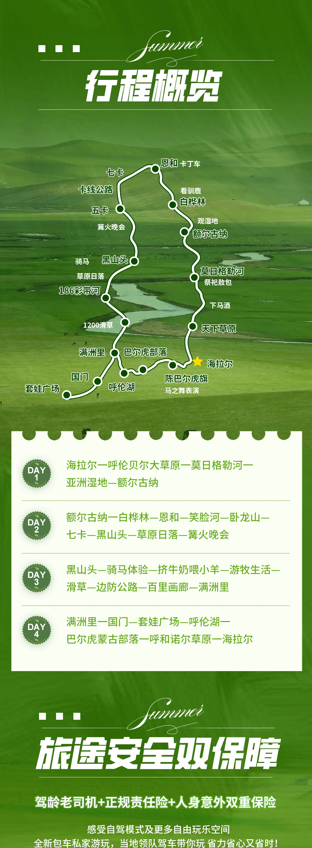 特別注明:本線(xiàn)路為呼倫貝爾云起旅行社獨(dú)創(chuàng)路線(xiàn),本線(xiàn)路為濃縮型,4天路線(xiàn)看的是5天風(fēng)景,所包含的景區(qū)與游玩的項(xiàng)目同比其他家要多出很多?。。。?/span>