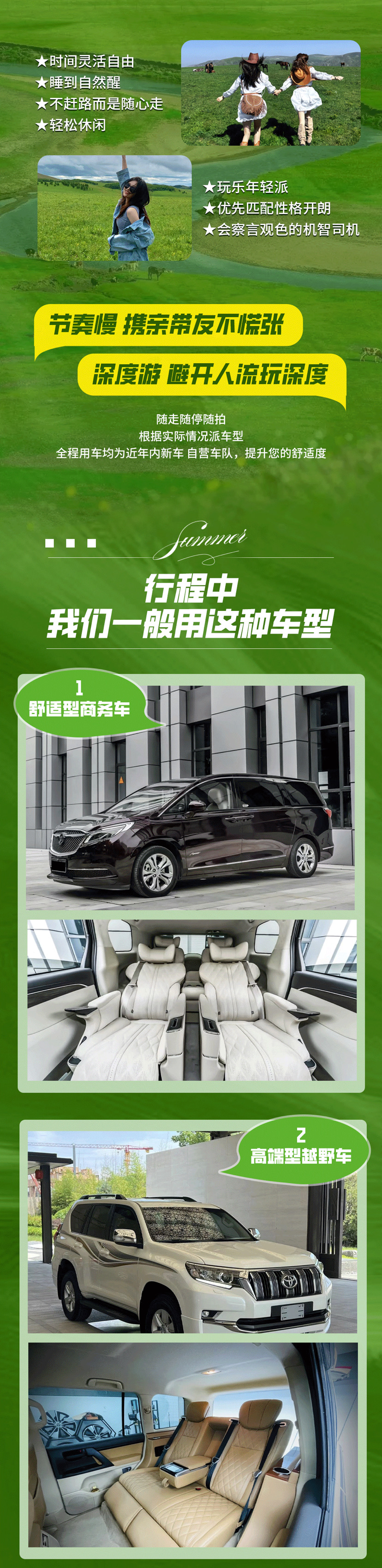 4.行程特色《準(zhǔn)新越野車(chē)/suv穿越草原、新車(chē)提升路途中的舒適度、輕松休閑行程、更符合大眾旅游標(biāo)準(zhǔn)、主打自由行》